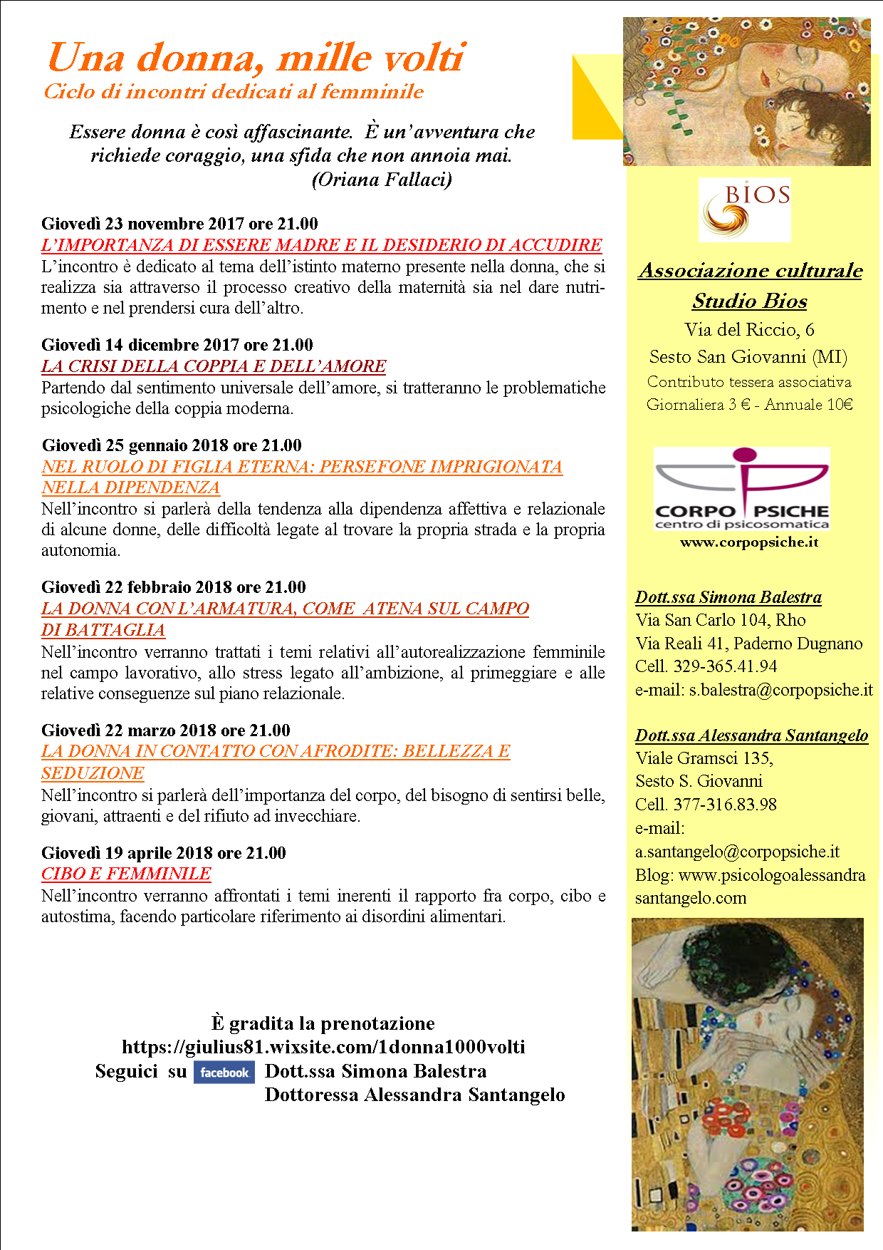 Una viaggio alla scoperta di aspetti psicologici inconsci nascosti nell’animo femminile, tenuto dalla Dott.ssa Alessandra Santangelo (Psicologa-Psicoterapeuta) e dalla Dott.ssa Silvia F. Calati (Psicologa-Psicoterapeuta), presso il Centro BIOS di Via del Riccio 6, Sesto San Giovanni (MI)